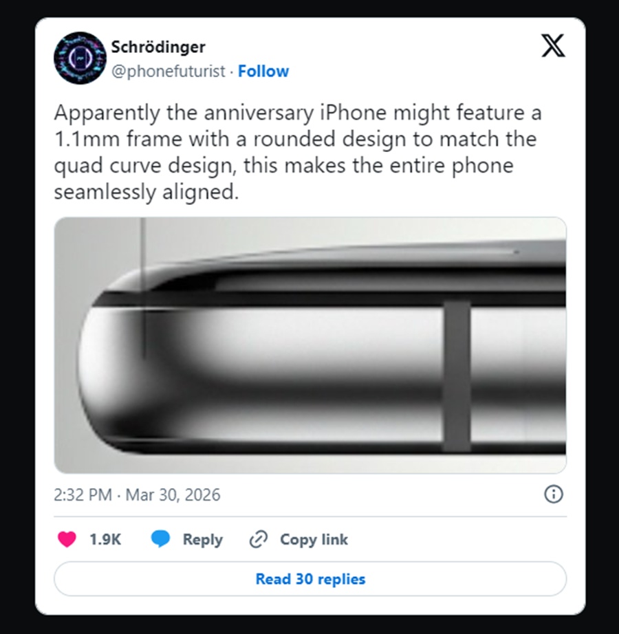 Edinilen bilgilere göre iPhone 20’nin öne çıkan unsurlarından biri çerçeve yapısı olacak. Yeni modelde yaklaşık 1,1 mm kalınlığında, oldukça ince ve yuvarlatılmış bir çerçeve tasarımının tercih edilmesi bekleniyor. Bu yapı, dört kenardan kavisli ekran teknolojisiyle birlikte kullanılacak. Böylece ekran yalnızca yanlardan değil, üst ve alt bölümlerden de çerçeveye doğru akış sağlayan bir formda olacak.